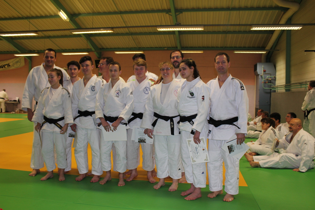 Lors de cette cérémonie, nous avons fait fureur avec toutes nos nouvelles ceintures noires. Marine Prêtre, Camille Schindler, Loïc Gabet, Erwan René, Brandon Delamarre, Flavien Aubert, Clément Beaufils et Dany Teurquety ont reçu leur diplôme de ceinture noire 1er dan. Puis Olivier Gantier et Denis Hété ont fait une démonstration du Go No Sen (kata présenté pour leur examen 4ème) et Olivier a reçu des mains de son Parrain Judo, Sébastien Mansois, son professeur, son diplôme de sa ceinture noire 4ème dan.